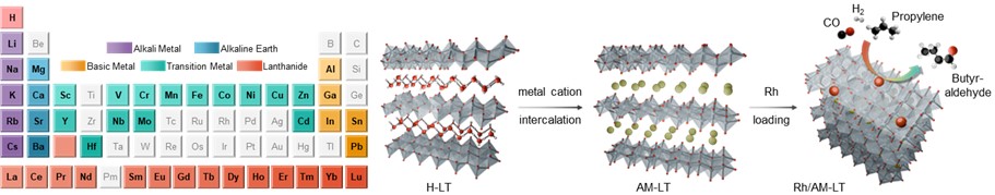 Layered titanates (LTs) offer exceptional structural and chemical tunability, enabling precise modulation of their electronic states and catalytic properties. However, systematic studies on the range of cations that can serve as intercalants for LTs remain limited, and conventional synthesis methods often require additional treatments for cation intercaltion. In this study, we present a cation-free H+ (H3O+)-intercalated LT as a versatile platform for direct cation insertion. This LT can be intercalated with single metal cations (42 metals from five groups) or a combination of 5–30 cations without structural deformation. Intercalation with alkali metals (AMs) precisely tuned the charge density of Rh species when the prepared LTs are used as catalytic supports. Among the Rh-loaded AM-bearing LTs, Rh/K–LT delivered the highest turnover frequency (23 685 h−1), surpassing those of other AM-intercalated systems and previously reported Rh-based heterogeneous catalysts, during propylene hydroformylation. Combined in situ/ex situ analyses and density functional theory calculations revealed that AM intercalation promotes charge transfer to Rh, thereby enhancing adsorption behavior and catalytic activity. This work establishes not only a broad cation intercalation library but also a generalizable strategy for cation engineering in LTs, highlighting the potential of intercalation-driven charge modulation for rational catalyst design across diverse reactions.